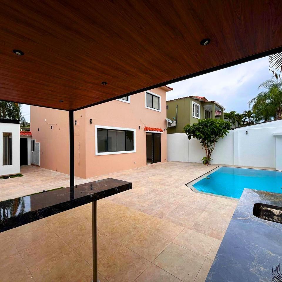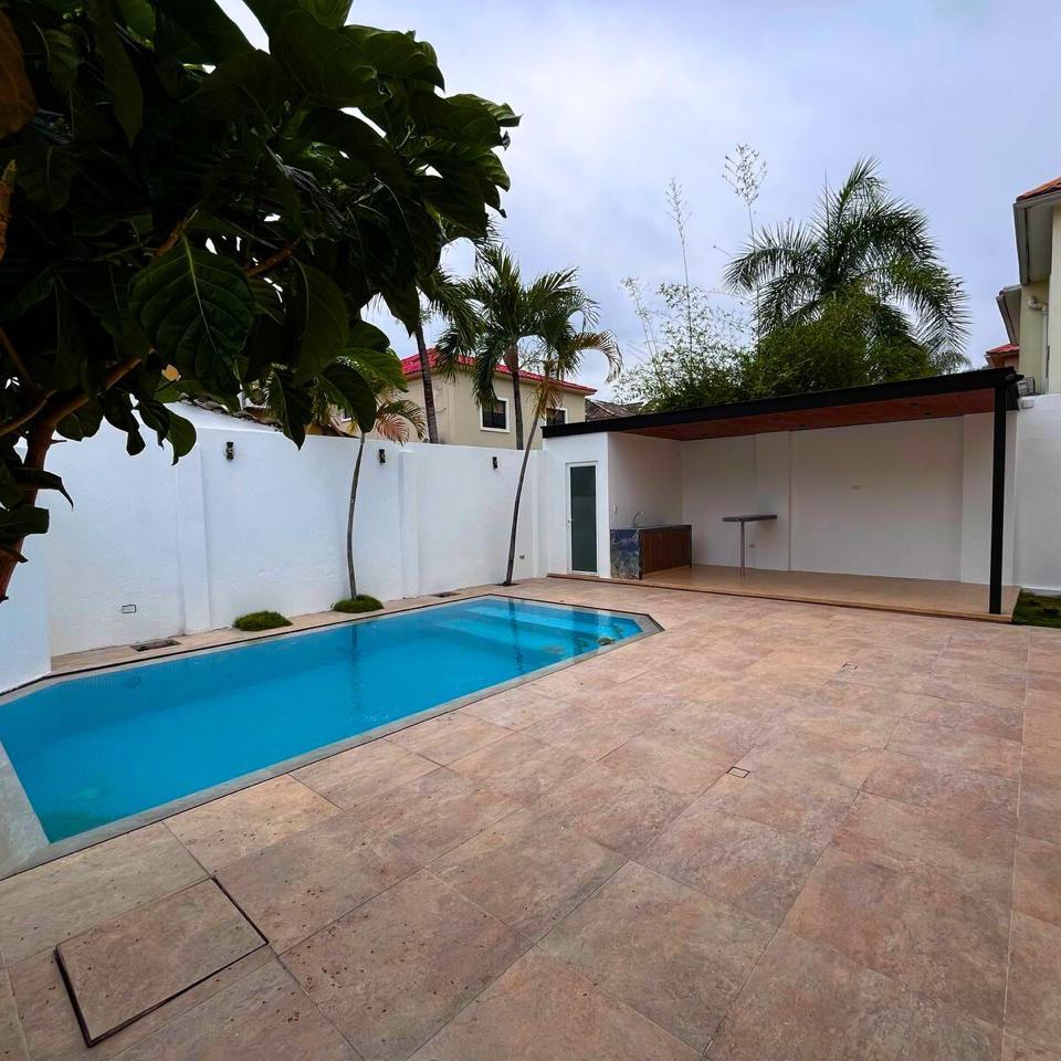 Amplio patio con: 🏊♀️ Piscina privada 🛁 Baño social 🎯 Área de BBQ 🪴 Galería cubierta 🎮 Estudio o sala de juegos 💰
